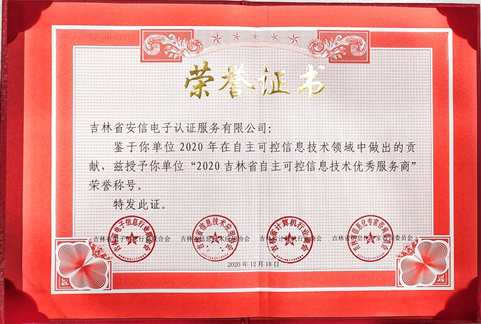 2020年12月18日,吉林省自主可控?cái)?shù)字化推進(jìn)大會(huì)在長(zhǎng)春舉行。安信CA受邀參加本次大會(huì),并獲得“2020吉林省自主可控信息技術(shù)優(yōu)秀服務(wù)商”的榮譽(yù)稱(chēng)號(hào)。