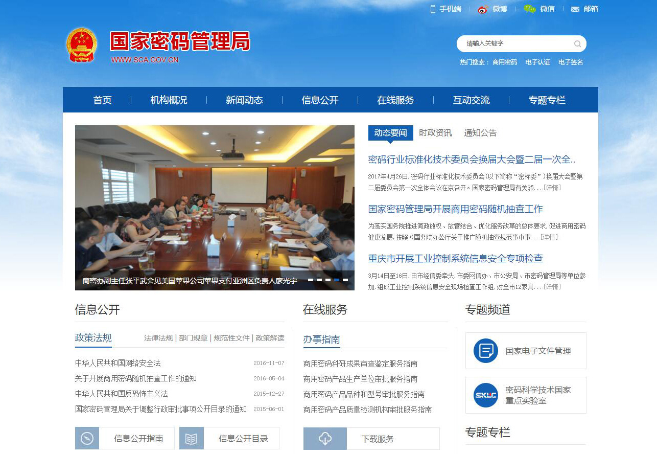 國(guó)家密碼管理局門戶網(wǎng)站是國(guó)家密碼管理局在互聯(lián)網(wǎng)上發(fā)布政務(wù)信息、提供在線服務(wù)、與公眾互動(dòng)交流的重要平臺(tái),是宣傳密碼政策法規(guī)、普及密碼知識(shí)、促進(jìn)廣泛應(yīng)用的重要渠道,也是社會(huì)公眾了解密碼工作的重要途徑。