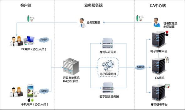 針對行政審批的安全需求,安信CA基于第三方數(shù)字證書、電子簽名及電子簽章等技術(shù)來保障業(yè)務(wù)辦理過程中的身份真實性、數(shù)據(jù)安全性、數(shù)據(jù)完整性及操作不可抵賴性,系統(tǒng)架構(gòu)如下圖所示: